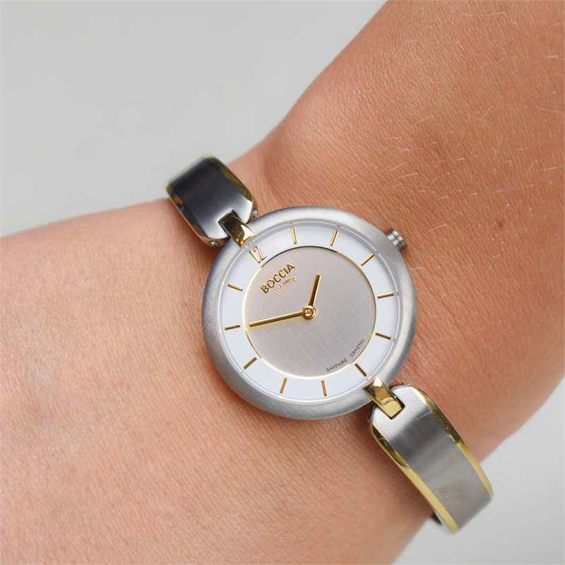 Dit dameshorloge van Boccia Titanium heeft een nette uitstraling. De zilverkleurige horlogekast zorgt voor een stijlvolle look en de witte wijzerplaat maakt het horloge net wat sierlijker. Het horloge heeft een kastdiameter van 30mm, een saffierglas en is 5ATM. Combineer dit prachtige exemplaar met de andere sieraden van Boccia Titanium voor een complete look. Aan de ronde kast zit een titanium stijve bi-color band.