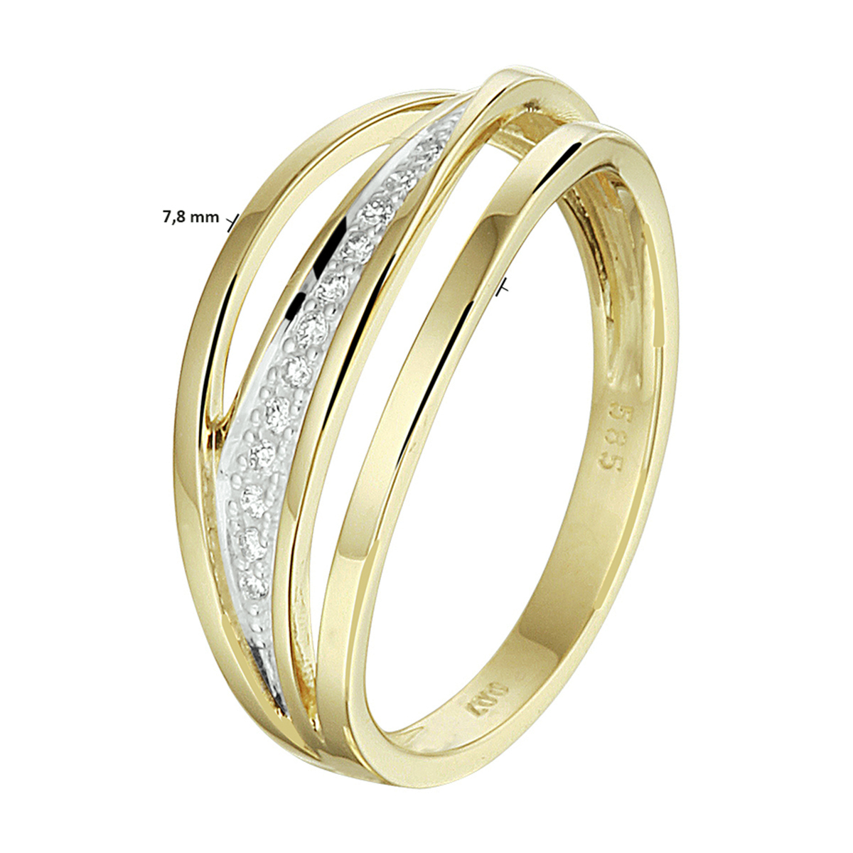 14 karaat Geelgouden ring uitgevoerd met een schitterende diamant rij. De ring heeft een breedte van 7.8mm en heeft een totaal van 0.07ct h si