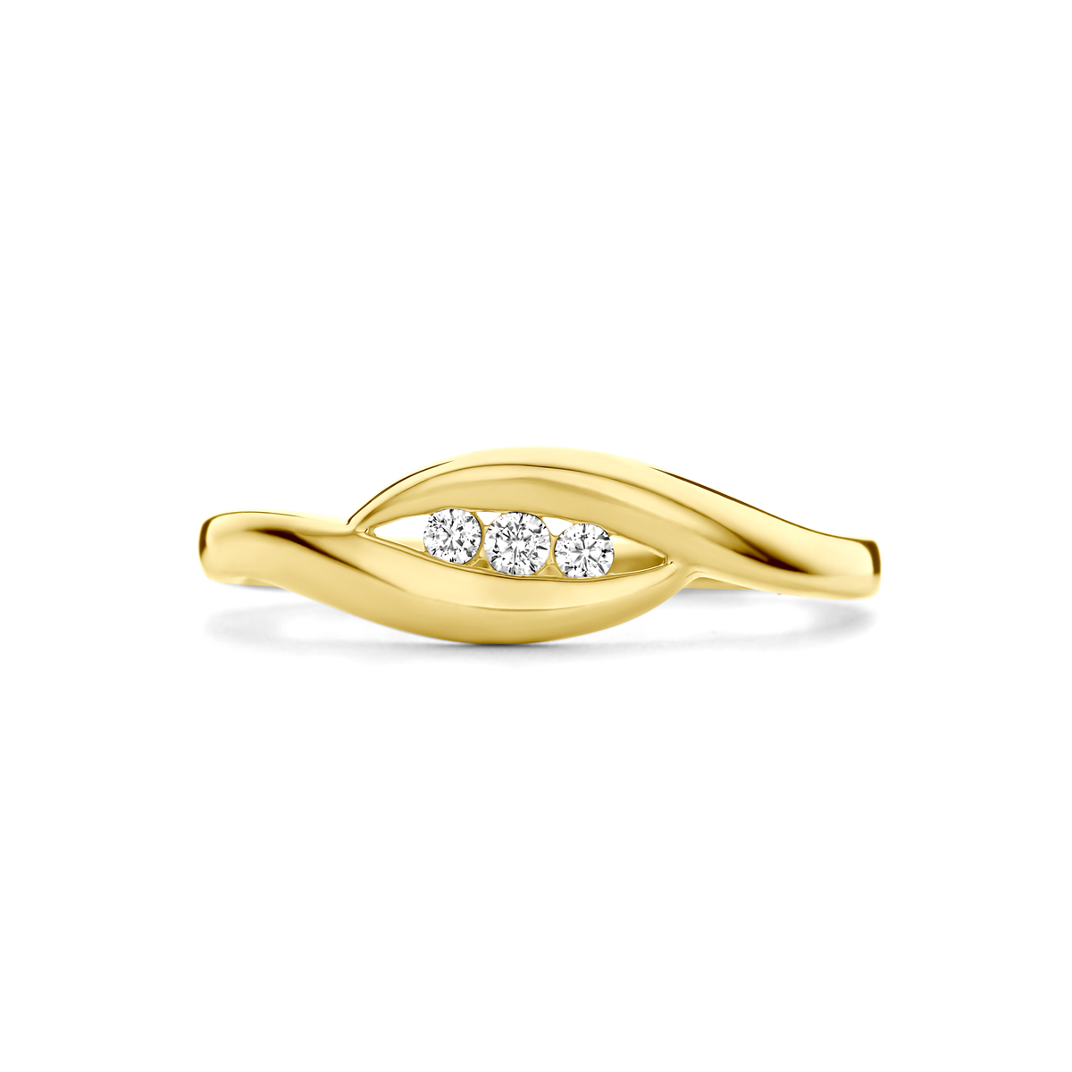 14k Geelgouden ring uitgevoerd met zirkonia. De ring heeft een breedte van 6mm.