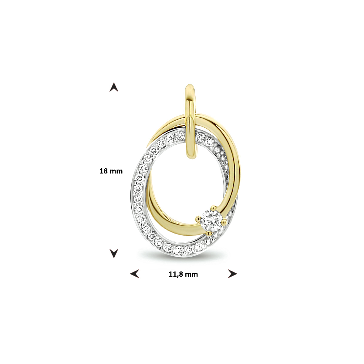 14k Bicolor geel- en witgouden hanger uitgevoerd met schitterend diamant. De hanger heeft een totale hoogte van 1.8cm en een breedte van 11.8mm.