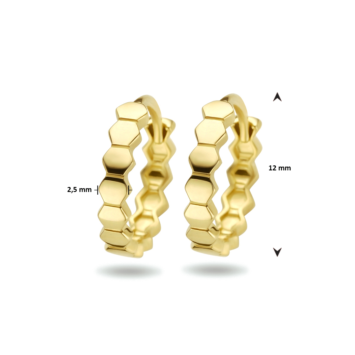 14k Geelgouden klapoorringen uitgevoerd met zeshoeken. De oorringen hebben een diameter van 12mm en een dikte van 2.5mm.
