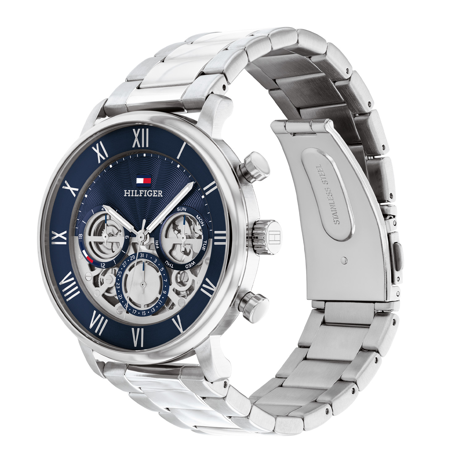 Dit specifieke horloge van Tommy Hilfiger uit de Legend serie met artikelnr: TH1710569 is een stoer herenhorloge die zeker in je collectie past. Het stalen herenhorloge heeft een ronde zilverkleurige kast met een gladde bezel en een blauwe opengewerkte wijzerplaat met dag,- datum en 24-uursaanduiding en zilverkleurige wijzers en accenten. De zilverkleurige schakelband is op lengte verstelbaar en heeft een vouwsluiting. Het horloge heeft een mineraalglas, een doorsnee van 44mm en is 5ATM.