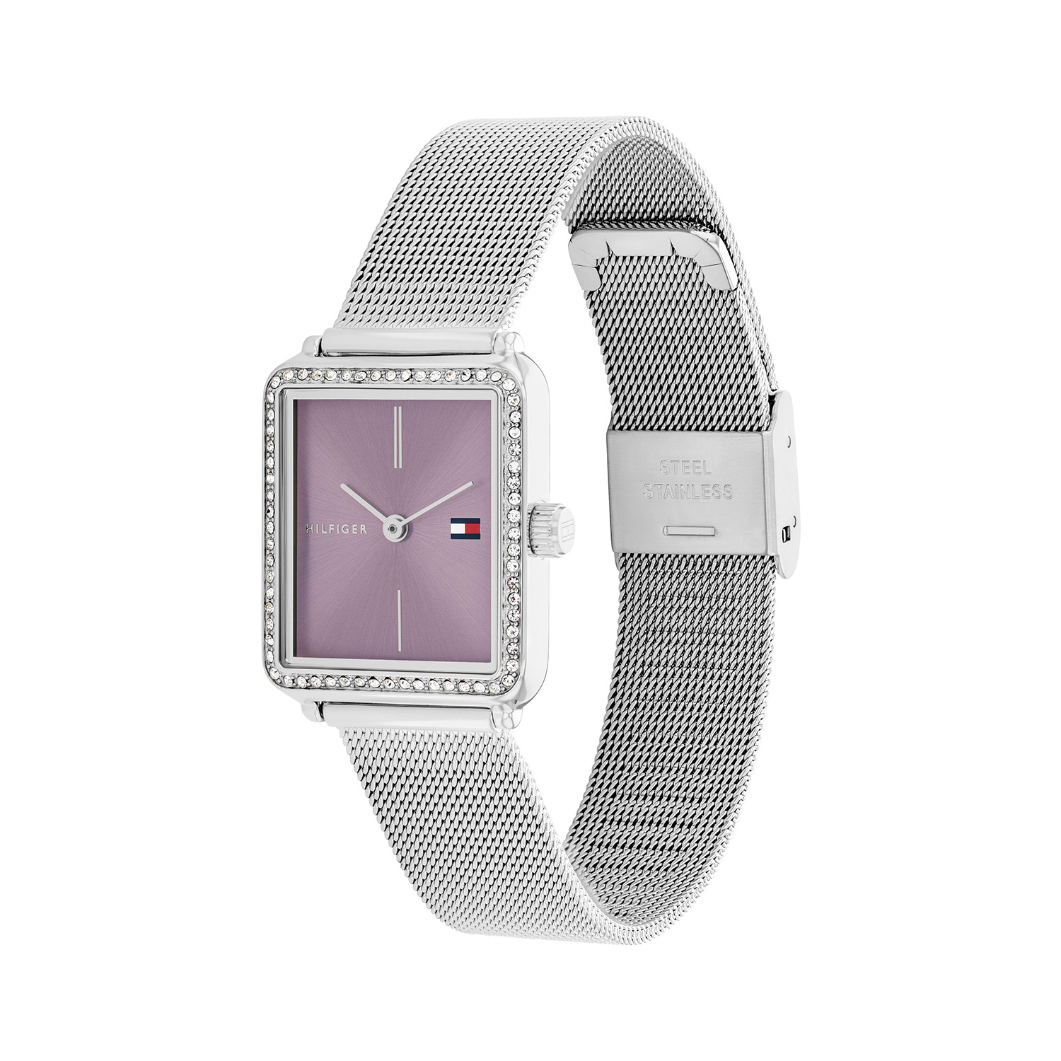 Dit specifieke horloge van Tommy Hilfiger uit de Tea serie met artikelnr: TH1782790 is een luxe dameshorloge die niet in je collectie mag ontbreken. Het stalen dameshorloge heeft een rechthoekige zilverkleurige kast met een bezel volgezet met kristallen en een paarse sunray wijzerplaat met fijne wijzers en het Tommy logo. Aan de kast zit een zilverkleurige milanese band met druksluiting. Het horloge heeft een mineraalglas, een afmeting van 21x24mm en is 3ATM.