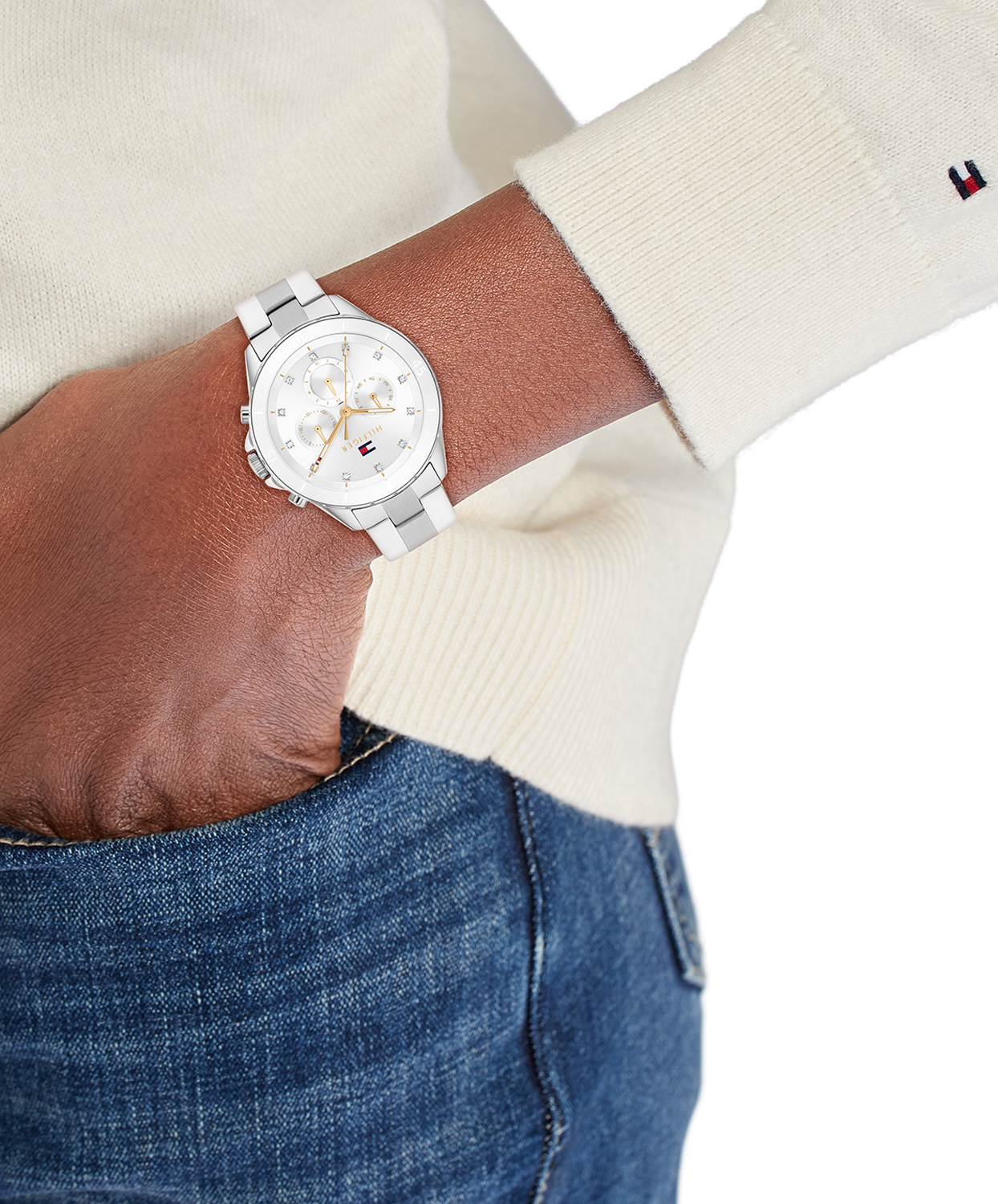 Dit specifieke horloge van Tommy Hilfiger uit de Mellie serie met artikelnr: TH1782707 is een luxe sportief dameshorloge die niet in je collectie mag ontbreken. Het stalen dameshorloge heeft een ronde zilverkleurige kast met een witte ceramic bezel en een witte sunray wijzerplaat met dag, - datum,- en 24-uursaanduiding. De uren worden weergegeven met kristallen. De zilverkleurige schakelband is op lengte verstelbaar en heeft een vouwsluiting. Het horloge heeft een mineraalglas, een doorsnee van 40mm en is 5ATM.