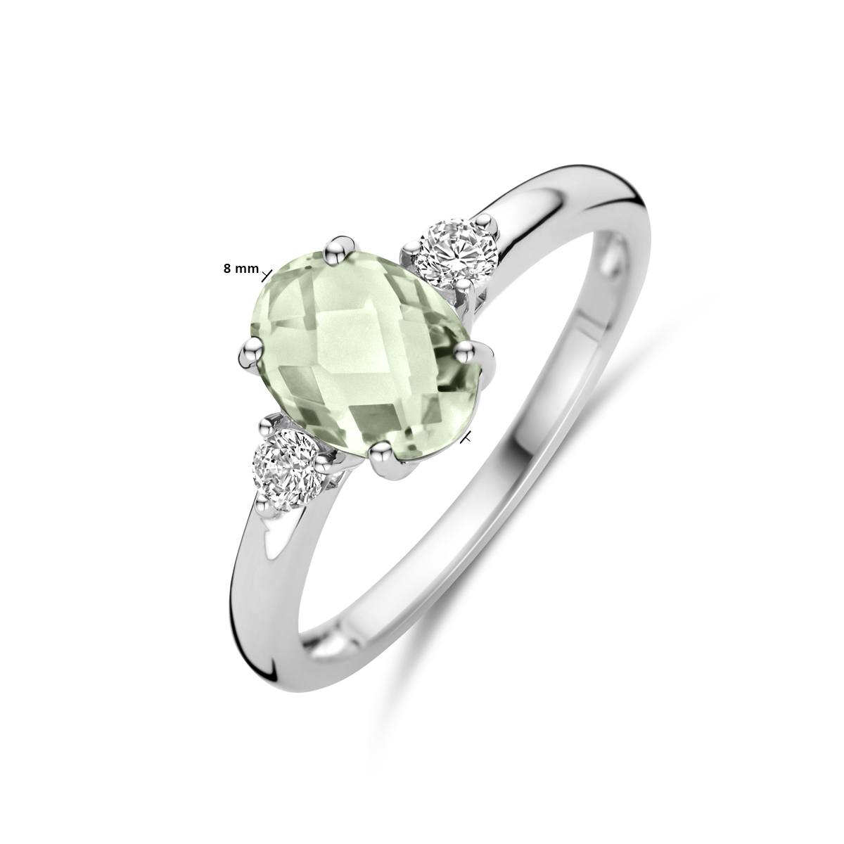 Gerhodineerd 925 zilveren ring uitgevoerd met groen amethist en zirkonia. De ring heeft een breedte van 8mm. De groen amethist heeft een maat van 8x6mm en de zirkonia van 2.5mm.